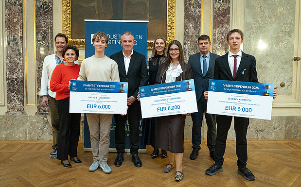 Das Stipendium für aus der Ukraine geflüchtete MINT-High-Potentials wurde 2023 auf Initiative der Industriellenvereinigung sowie Univ.-Prof. Michael Eichmair, PhD und Mag. Dmytro Rzhemovskyi, BA (Projekt Mathematik mach Freude, Universität Wien) zur Förderung begabter Studierender ins Leben gerufen. Die Stipendiatin und Stipendiaten, die derzeit in Österreich studieren, gewannen bereits ukrainische und internationale Wissenschaftswettbewerbe. Severyn Khomych, Anastasiya Stakhanska und Davyd Stepanenko setzten im Sommer 2025 praxisnahe Workshops über „Bewegung mit Elektronik und Mikrocontrollern“, „MINT trifft Medizin – Deine Entdeckungsreise in den menschlichen Körper“ und „Data Analysis in R with Applications in Biology“ für Jugendliche um.