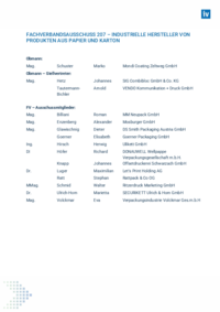 FACHVERBANDSAUSSCHUSS 207 – INDUSTRIELLE HERSTELLER VON PRODUKTEN AUS PAPIER UND KARTON Obmann: Mag. Schuster Marko Mondi Coating Zeltweg GmbH Hetz Johannes SIG Combibloc GmbH & Co. KG …